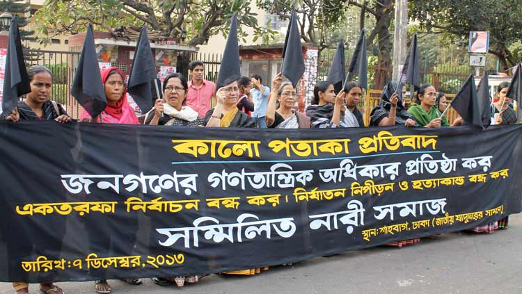 গত ৭ ডিসেম্বর বিকেল ৩টায় শাহবাগ জাদুঘরের সামনে সম্মিলিত নারী সমাজের আয়োজনে কালো পতাকা প্রতিবাদ সমাবেশ অনুষ্ঠিত হয়। এই সমাবেশে বিভিন্ন নারী সংগঠন, শ্রমিক ও নানা পেশার নারীরা অংশ্রগ্রহণ করেন, সম্মিলিত নারী সমাজ দাবী জানায় এক তরফা নির্বাচন বন্ধ কর, নির্যাতন, নিপীড়ন ও আগুনে পুড়িয়ে হত্যাকাণ্ড বন্